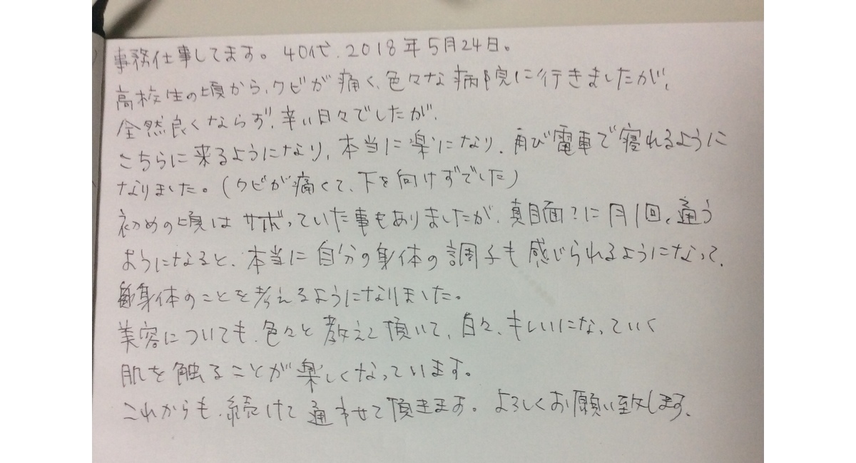 高校生の時から、クビが痛く色々な病院に行きましたが、こちらに来るようになり、本当に楽になり、再び電車で寝れるようになりました。(クビが痛くて下を向けずでした)初めの頃はサボっていた事もありましたが、真面目に月一回、通うようになると、本当に自分の身体の調子も感じられるようになって、身体のことを考えるようになりました。美容についても、色々と教えて頂いて日々キレイになっていく肌を触ることが楽しくなっています。